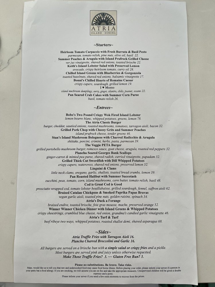Located in the heart of Edgartown, Atria elegantly blends a refined dining experience with a relaxed atmosphere. This upmarket venue offers an array of delicious options, catering to diverse palates with an impressive selection of vegan and vegetarian dishes. Customers rave about the exquisite appetizers, beautifully plated and bursting with flavor, showcasing the chef's attention to detail.
